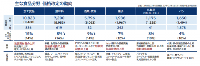 内容では「パン」(1578品目)が全食品分野で最多となった。パンが最多となるのは、輸入小麦価格改定の影響でパンが一斉値上げとなった昨年 7 月以来、1年ぶりとなる。