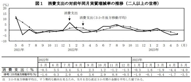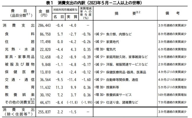 総務省統計局発表の5月の「家計調査報告」によれば、2人以上の世帯の消費支出は28万6443円で、前年同月比は物価変動の影響を除いた実質では4.0%の減少、名目0.4%の減少となった。前月比(季節調整値)は実質1.1%の減少だった。