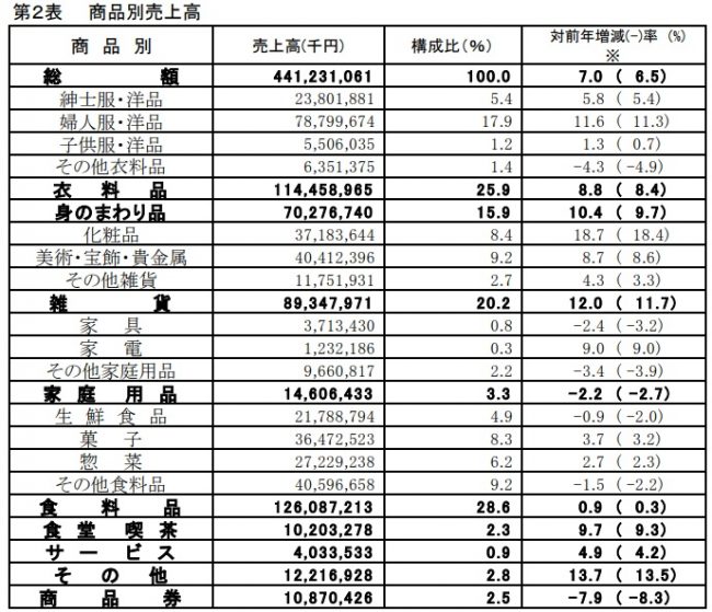 商品別では、主要5品目のうち4品目で前年実績を超えた。身のまわり品は10.4%増、雑貨は12.0%増と二桁の伸びとなった。ラグジュアリーブランドや高額商材は引き続き好調。化粧品はメイクアップやUV関連商品が伸びた。バッグ、靴、旅行用品のほか、傘などレイングッズも好調だった。