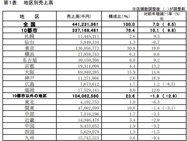地区別では、インバウンドと高額商材が好調な都市(10都市/10.1%増)が、9地区で前年実績をクリアし21カ月連続プラスとなった。一方で地方(10都市以外の7地区)は0.1%減と2カ月連続でマイナスとなった。