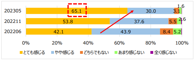 値上がりの影響については「とても感じる」「やや感じる」と回答した人の合計が95.1%に上った。全年代で値上げによる家計の負担を実感している結果となった。値上がりの影響を「とても感じる」と答えていた人が、2022年11月に実施した前回調査では42.1%だったが、今回は11.3%増えて65.1%を占めた。1年以上続く物価高騰に終わりは見えず、以前よりも値上げを実感している傾向が見られた。