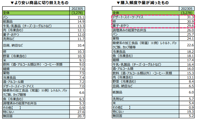 (31.3%)、「卵」(30 .9%)、「菓子・おやつ」(29 .6%)。全体として、安い商品に切り替えるというより、購入頻度や量が減ったと回答する人が多いことがわかった。「パン」と「菓子・おやつ」は「より安い商品に切り替えたもの」と「購入頻度や量が減ったもの」のどちらにもトップ5に入っている。