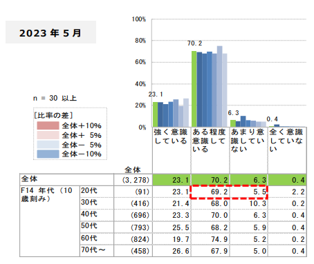 節約を「強く意識している」「ある程度意識している」と回答した割合は全体で93.3%だった。20代で「あまり意識していない」人が前回より13.0%減少して5.5%だったのに対して、「ある程度意識している」人が14.4%増加して69.2%となった結果から、若年層における節約の意識が高くなっていることがわかる。節約を「全く意識していない」人は全年代で減少している。