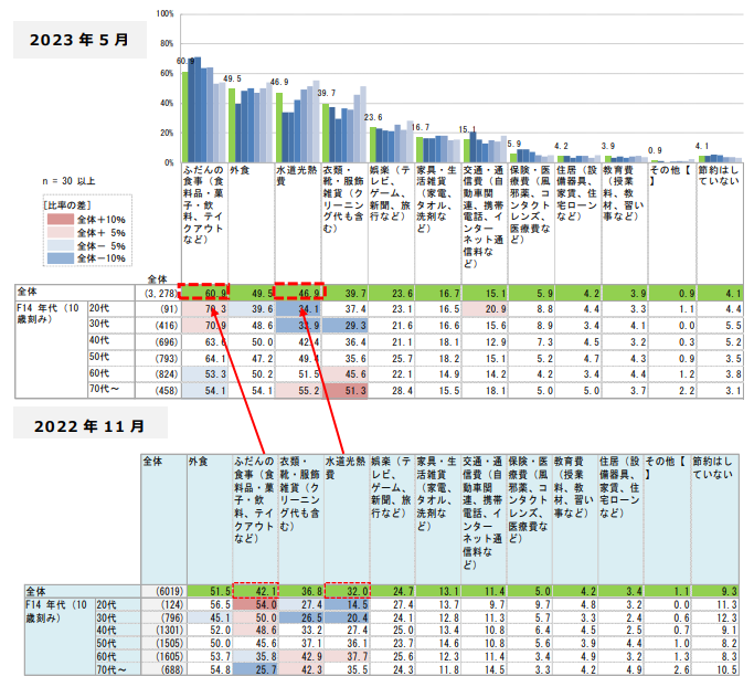 家庭での節約項目で一番多かったのは「ふだんの食事」(60.9%)で、前回から18.8%増加した。年代別にみても、全年代で大幅に増加している。次に多かった節約項目は「外食」で、49.5%と、前回とほぼ横ばいだった。続いて「水道光熱費」を節約していると回答した人は前回から14.9%増加の46.9%で、続く電気料金の値上げによる節約意識の上昇がみられる。