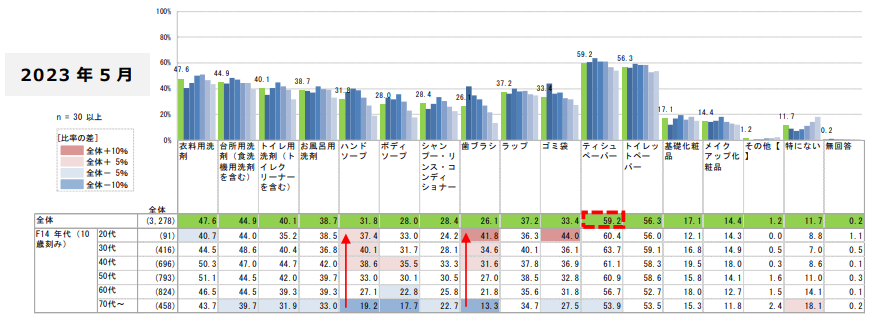 日用消耗品の購入時に価格の安さを重視する1位の商品は「ティッシュペーパー」(59.2%)、2位が「トイレットペーパー」(56.3%)、3位が「衣料用洗剤」(47.6%)だった。「ハンドソープ」や「歯ブラシ」は年代が下がるほど割合が高くなり、若年層は価格の安さを重視して購入することが多いと推測できる。反対に60・70代は、価格の安さを重視するものは全体と比較すると少ない傾向となった。