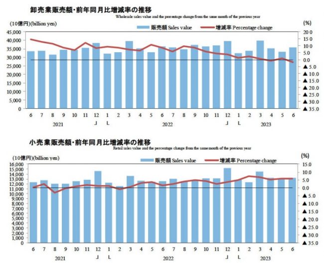 6月の商業販売額は49兆0010億円、前年同月比0.2%の増加となった。内訳は卸売業が35兆7760億円(1.8%減)、小売業は13兆2250億円(5.9%増)。