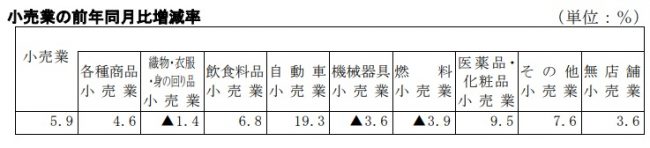 小売業を業種別にみると、自動車小売業が前年同月比19.3%増、医薬品・化粧品小売業が9.5%増、その他小売業が7.6%増、飲食料品小売業が6.8%増、各種商品小売業(百貨店など)が4.6%増、無店舗小売業が3.6%増となった。一方、燃料小売業が3.9%減、機械器具小売業が3.6%減、織物・衣服・身の回り品小売業が1.4%減となった。