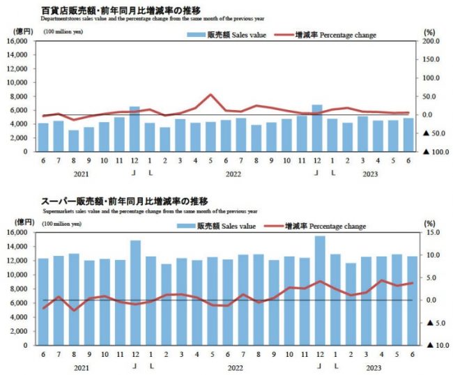 小売業を業態別にみると、6月の百貨店・スーパー販売額は1兆7465億円で前年同月比4.4%の増加。百貨店は4844億円(5.8%増)、スーパーは1兆2621億円(3.8%増)。