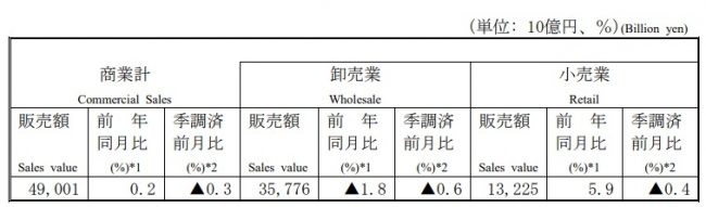 なお、商業販売額の季節調整済(季節、曜日・祝祭日・月の長さの要因を調整したもの)前月比は0.3%の低下、卸売業は0.6%の低下、小売業は0.4%の低下だった。