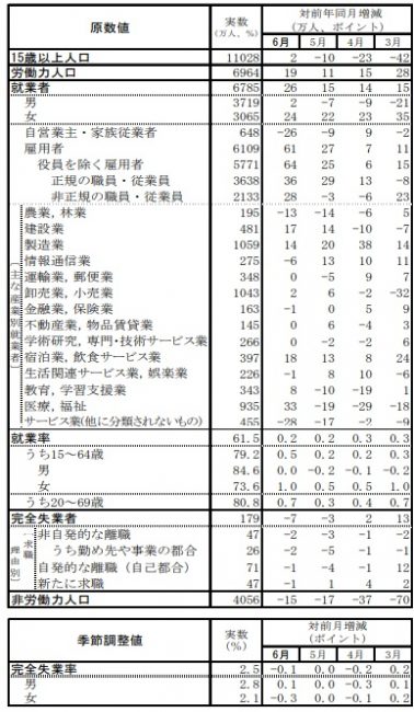 総務省統計局が6月の「労働力調査」を発表した。就業者数6785万人で、前年同月に比べ26万人増加し、11カ月連続で増加した。