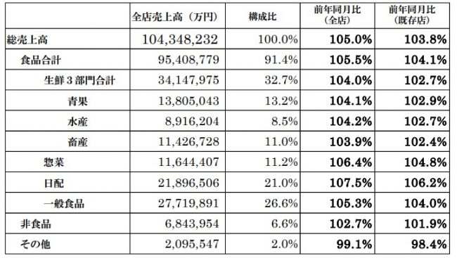 部門別では青果が1380億5043万円で既存店102.9%、全店104.1%。