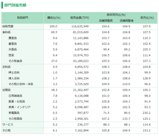 部門別の数値では総販売額の69.5%を占める「食料品」が8101億9609万円で104.8%、全店では104.6%。衣料品が685億4572万円で108.6%、全店では108.3%。売上構成比は5.9%。住関品は2136億2497万円で104.4%、全店では102.8%。売上構成比は18.3%。1㎡当たり売上高は4万7239円で前年同月比105.8%だった。