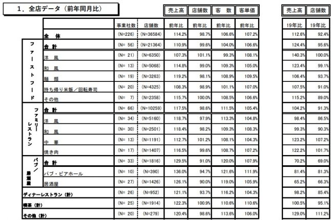 7月外食統計|全体売上げは前年同月比114.2%・19年比112.6%