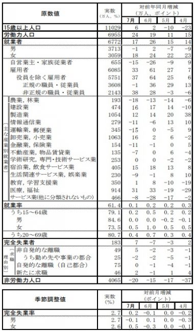 7月労働力調査|就業者数6772万人/卸売業・小売業就業者前年比16万人増加