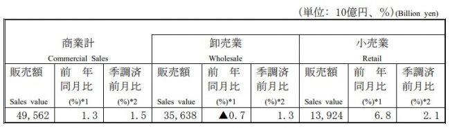 なお、商業販売額の季節調整済(季節、曜日・祝祭日・月の長さの要因を調整したもの)前月比は1.5%の上昇、卸売業は1.3%の上昇、小売業は2.1%の上昇だった。