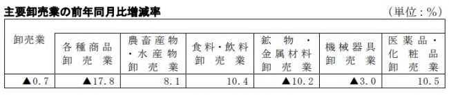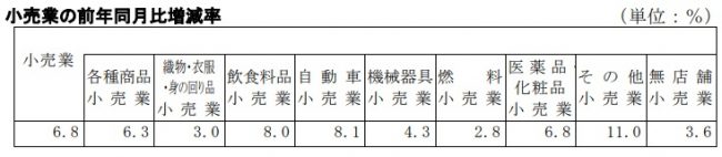 小売業を業種別にみると、その他小売業が前年同月比11.0%増、自動車小売業が8.1%増、飲食料品小売業が8.0%増、医薬品・化粧品小売業が6.8%増、各種商品小売業(百貨店など)が6.3%増、機械器具小売業が4.3%増、無店舗小売業が3.6%増、織物・衣服・身の回り品小売業が3.0%増、燃料小売業が2.8%増となった。