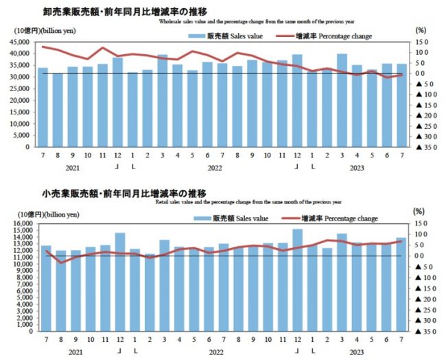 7月の商業販売額は49兆5620億円、前年同月比1.3%の増加となった。内訳は卸売業が35兆6380億円(0.7%減)、小売業は13兆9240億円(6.8%増)。