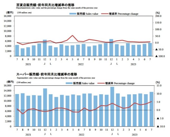 小売業を業態別にみると、7月の百貨店・スーパー販売額は1兆8741億円で前年同月比5.9%の増加。百貨店は5224億円(7.6%増)、スーパーは1兆3517億円(5.2%増)。