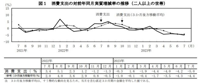 総務省統計局発表の7月の「家計調査報告」によれば、2人以上の世帯の消費支出は28万1736円で、前年同月比は物価変動の影響を除いた実質では5.0%の減少、名目1.3%の減少となった。前月比(季節調整値)は実質2.7%の減少だった。