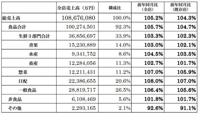 食品合計は1兆0027億4501万円で既存店104.7%。生鮮3部門合計は、3685億6697万円で102.3%だった。