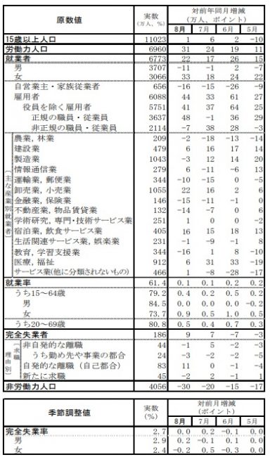 8月労働力調査|就業者数6773万人/卸売業・小売業就業者前年比22万人増加