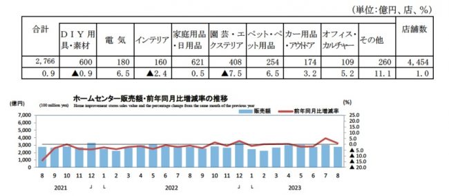 それによれば8月のホームセンター販売額は2766億円、前年同月比0.9%増だった。店舗数は4454店で前年比1.0%の伸長。