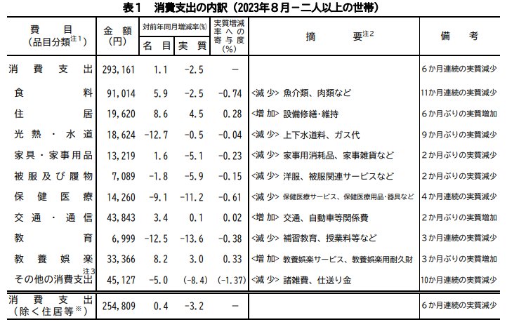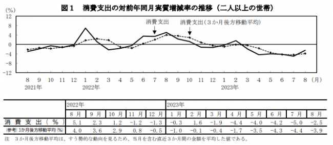 2人以上の世帯の消費支出は29万3161円で、前年同月比は物価変動の影響を除いた実質では2.5%の減少、名目では1.1%増加した。前月比(季節調整値)は実質3.9%増加した。