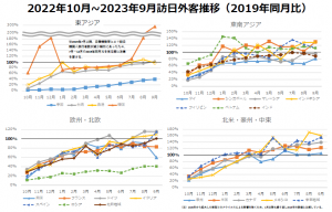 地域別では、23市場中15市場(韓国、台湾、シンガポール、インドネシア、フィリピン、ベトナム、豪州、米国、カナダ、メキシコ、ドイツ、イタリア、スペイン、北欧地域、中東地域)で、9月として過去最高を記録したほか、メキシコにおいては単月過去最高を更新した。シンガポールをはじめとした東南アジア、また米国やカナダで訪⽇外客数が増加したことが今月の回復率の押し上げ要因となった。