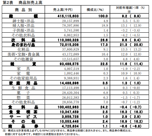 衣料品は羽織物やブラウス、カットソーなど秋物軽衣料に動きが見られた。食料品はマイナスに転じたが、彼岸など歳時記やインバウンド需要で菓子が引き続き好調だった。