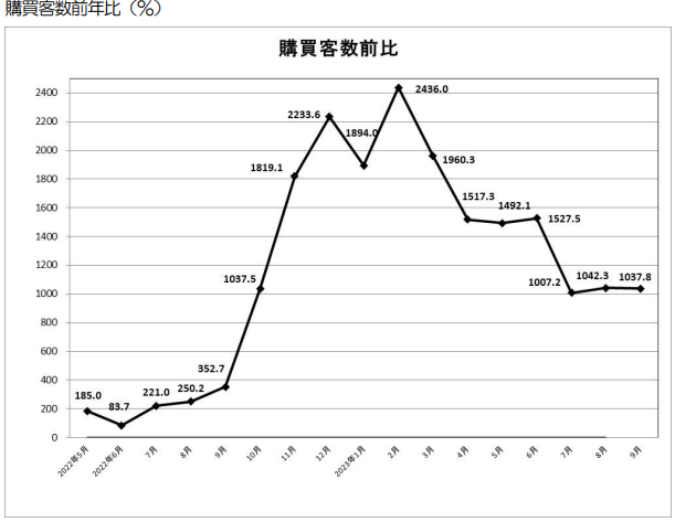 流通スーパーニュース > 統計 > 9月百貨店インバウンド動向|売上高約327億円255.6%増/19カ月連続プラス 9月百貨店インバウンド動向|売上高約327億円255.6%増/19カ月連続プラス 統計 / 2023年10月24日 ツイート (一社)日本百貨店協会(東京都中央区、村田善郎会長)のインバウンド推進委員会が、2023年9月の「外国人観光客の売上高・来店動向」を発表した。インバウンド推進委員店の88店舗が調査対象。 9月の免税総売上高は約326億6000万円(前年同月比255.6%増)。 売上高の内訳は「一般物品」が約284億円(245.1%増)、「消耗品」が約42億6000万円(346.1%増)となった。 ツイート