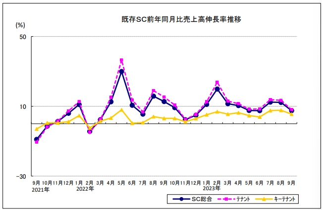 9月は記録的な残暑によって秋物衣料の動きが鈍いSCが多かったが、国内旅行客やインバウンド客の来館、館周辺でのイベント開催により飲食業種が売上げを牽引した。また、前年同月は台風のため臨時休業や営業時間短縮を行ったSCは反動増となった。