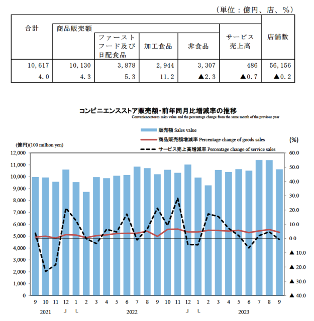 9月のコンビニエンスストアの商品販売額およびサービス売上高は1兆0617億円で前年同月比4.0%の増加。商品別にみると、ファーストフードおよび日配食品が3878億円(5.3%増)、加工食品が2944億円(11.2%増)、非食品が3307億円(2.3%減)となり、商品販売額は1兆0130億円(4.3%増)。サービス売上高は486億円(0.7%減)。