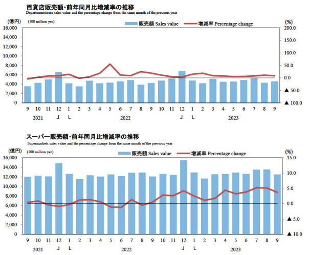 小売業を業態別にみると、9月の百貨店・スーパー販売額は1兆7084億円で前年同月比4.8%の増加。百貨店は4560億円(8.1%増)、スーパーは1兆2525億円(3.7%増)。