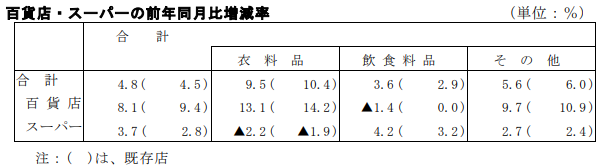 6業態の前年増減率は以下の通り。