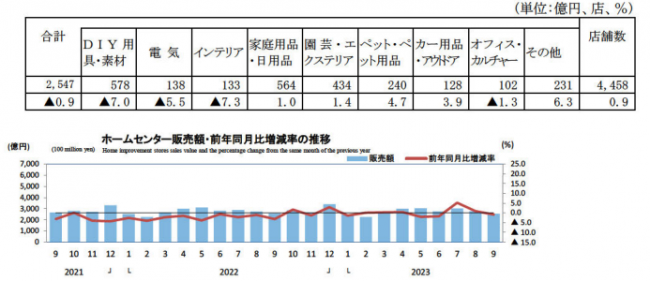 経済産業省大臣官房調査統計グループが発表した9月の商業動態統計速報では、9月のホームセンター販売額は2547億円、前年同月比0.9%減だった。店舗数は4454店で前年比1.0%の伸長。