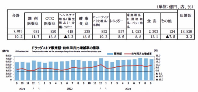 経済産業省大臣官房調査統計グループが発表した商業動態統計速報によると9月のドラッグストア販売額は7015億円、前年同月比10.2%増。店舗数は1万8826店と前年同月比3.3%の増加となった。