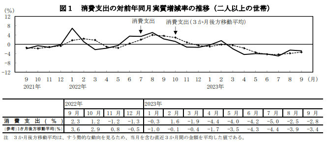 9月は、2人以上の世帯の消費支出が28万2969円で、前年同月比は物価変動の影響を除いた実質では2.8%の減少となった。名目では0.7%増加した。前月比(季節調整値)は実質0.3%増加した。