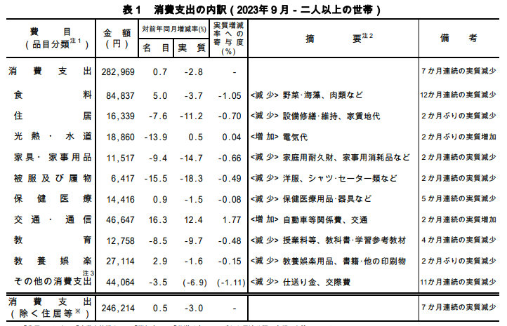 9月家計調査|2人以上世帯消費支出は28.3万円2.8%減/食費12カ月連続減少