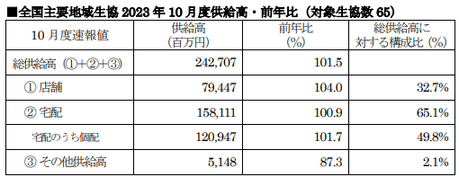 10月日生協統計|総供給高2427億円1.5%増/宅配0.9%増