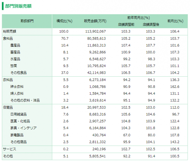 部門別の数値では総販売額構成比が70.7%の「食料品」が8058億5613万円で既存店105.2%。「住関品」の構成比は18.4%で、売上高は2099億7533万円の103.0%。「衣料品」は構成比5.5%で、売上高は627億3184万円の94.1%と前年クリアならず。
