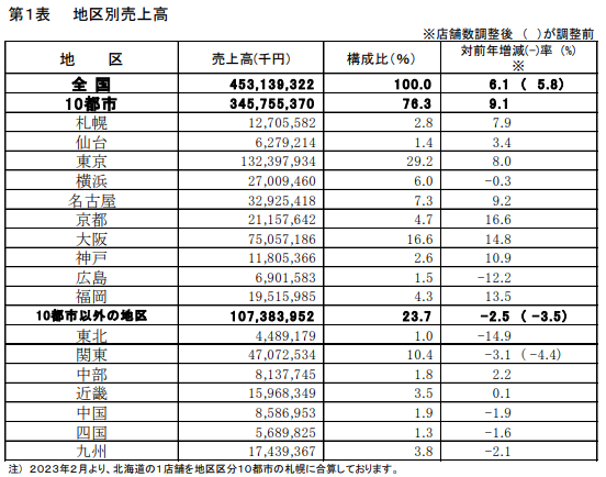 地区別では、10都市がインバウンドと増勢が続く高額商材などから、8地区で前年実績をクリアし、全体では9.1%増と好調に推移した。地方では5地区で前年割れし、2.5%減と4か月ぶりにマイナスに転じた。とくに東北が14.9%減と減速した。