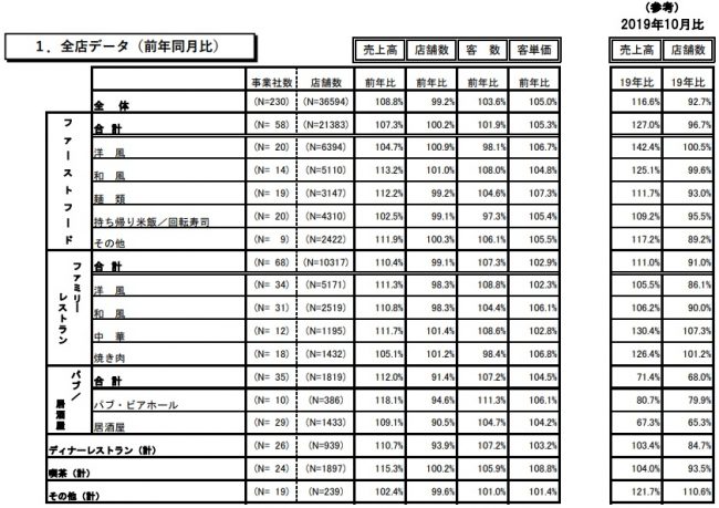 10月外食統計|全店売上高前年比8.8%増・19年比16.6%増/回復基調続く