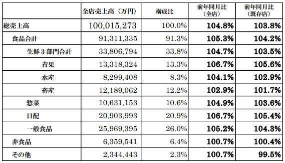 惣菜は1063億1153万円(3.6%増)、日配は2090億3993万円(5.4%増)、一般食品は2596億9395万円(4.3%増)。