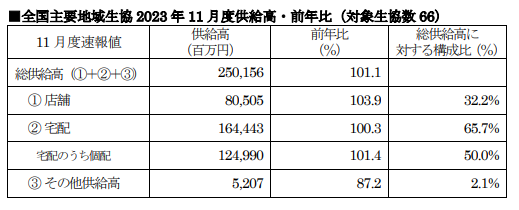 日本生活協同組合連合会(東京都渋谷区、土屋敏夫代表理事会長)は、2023年11月度の供給状況(売上高)を発表した。66生協が対象となっている。