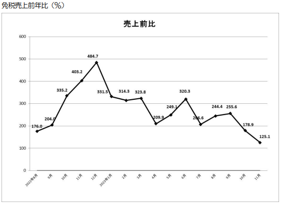 11月の免税総売上高は約394億9000万円で、前年同月比は125.1%増。売上高の内訳は「一般物品」が約346億9000万円で121.0%増、「消耗品」が約48億円で160.5%増だった。