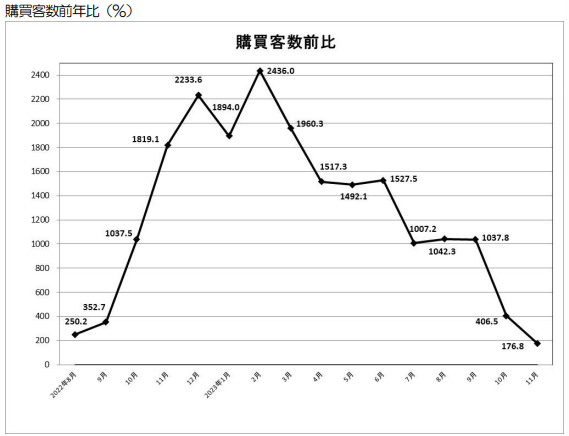 購買客数は約38万人で176.8%増。一人当たり購買単価は約10万3000円で前年同月よりマイナス18.7%となった。