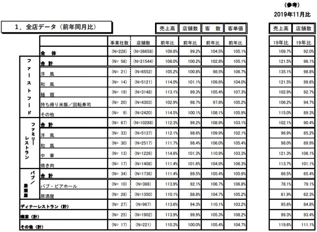 11月外食統計|全店売上高前年比9.8%増・19年比9.7%増/宴会需要が増加