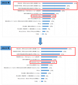 産地と品種を特定しない代わりに、販売価格を抑えたお米について、このようなものであってほしいと思うものを尋ねたところ、前年度と同様に「商品の袋に、使用されるお米の生産地・品種を書いてほしい」(44.1%)、「宅配誌面や売り場に、使用されるお米の生産地・品種を書いてほしい」(35.2%)、「生産地や製造過程の管理は品質を落とさず実施してほしい」(31.4%)という回答がトップ3だった。前年度の結果と比較すると全体的に減少傾向にあるなか、「できるだけ安くしてほしい」と回答した割合が2.6%増加という結果になった。