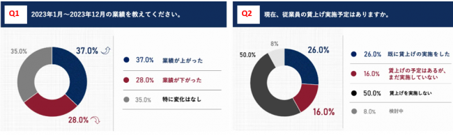 2023年の年間業績について、「上がった」企業は37%、「下がった」企業は28%となった。直近のエネルギー高や原料高などが業績に与えた影響について、約3割が「影響がなかった」、約2割が「悪影響があった」と回答している。