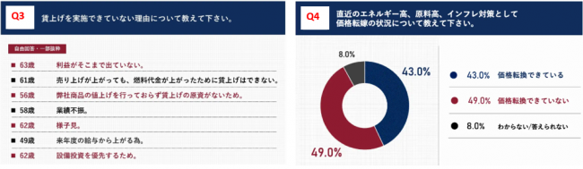 また、価格転嫁の状況について「価格転嫁ができていない」が49%と約半数だった。